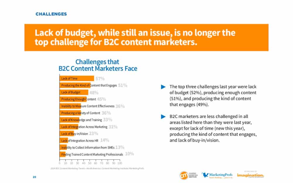 Yet according to the Content Marketing Institute, B2C content marketers struggle to create consistent, high-quality posts. The top five challenges included lack of time, producing engaging content, and producing enough content.